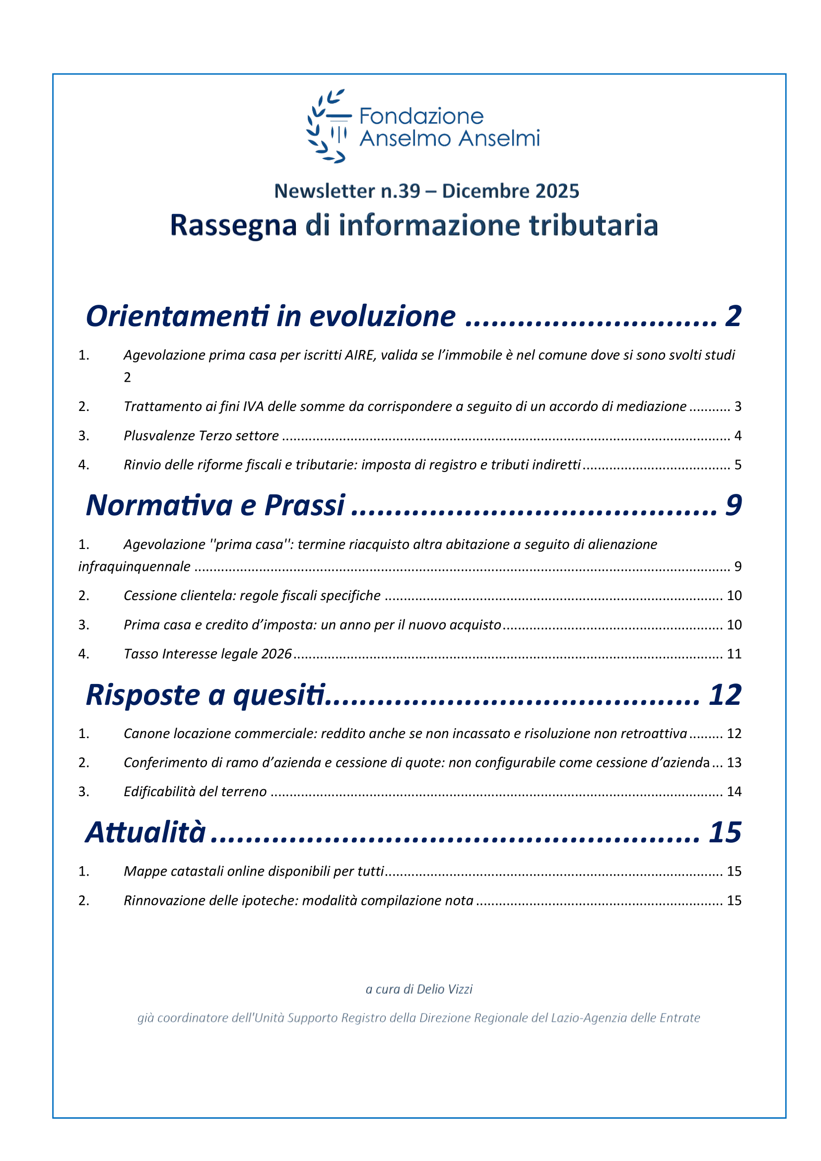 E' disponibile il nuovo numero della nuova rassegna di informazione tributaria di Dicembre 2025 a cura del dott. Delio Vizzi già Coordinatore dell’Unità Supporto Registro della Direzione Regionale del Lazio – Agenzia delle Entrate.